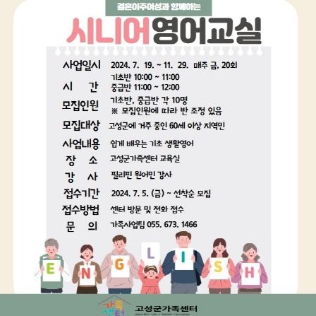 [경남도민뉴스] 고성군가족센터는 오는 5일부터 고성군에 거주 중인 60세 이상 지역주민을 대상으로 ‘시니어 영어교실’ 참여자를 모집한다.