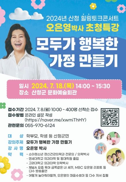 산청군은 오는 18일 산청군문화예술회관에서 오은영 박사의 힐링 토크 콘서트를 개최한다고 5일 밝혔다.