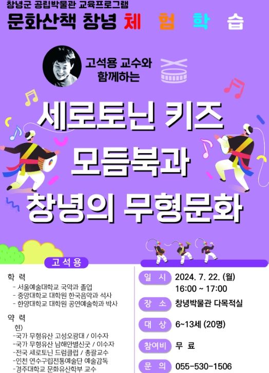[경남도민뉴스] 창녕군은 창녕군 공립박물관 '창녕 문화산책' 교육프로그램의 하나로 오는 22일 ‘세로토닌 키즈 모듬북과 창녕의 무형문화’를 운영한다고 밝혔다.