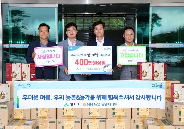 이날 이상훈 농협밀양시지부장, NH농협은행 조장균 외환사업부장 등 농협 관계자들이 외국인 근로자에게 전달해달라며 삼계탕 300개(400만원 상당)를 시에 전달했다.