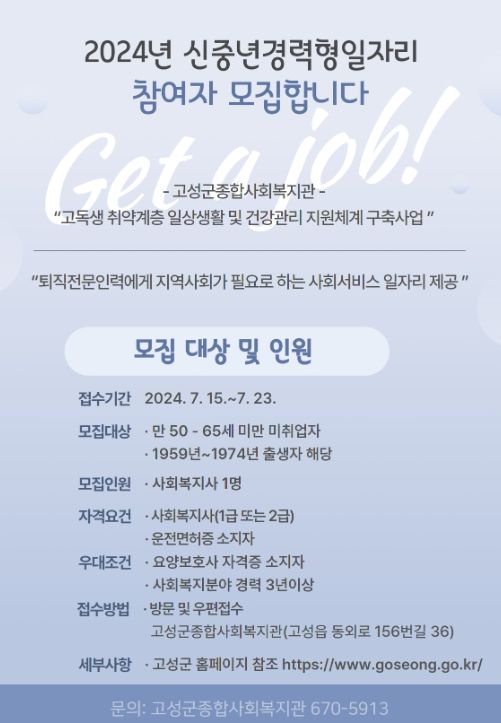 고용노동부 공모사업으로 시행된 일자리 사업에는 1959년부터 1974년생 중 사회복지사 1급, 2급 자격증을 소지하고 사회복지사 활동 경력이 있는 고성군민이면 지원할 수 있다.