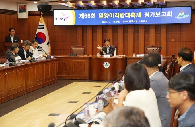 [경남도민뉴스] 밀양시는 지난 11일 시청 소회의실에서 안병구 시장과 허홍 밀양시의회 의장, 시의원, 행사 주관 단체장 등 40여 명이 참석한 가운데 지난 5월 23일부터 26일까지 4일간 개최된 제66회 밀양아리랑대축제 평가보고회를 개최했다고 밝혔다.