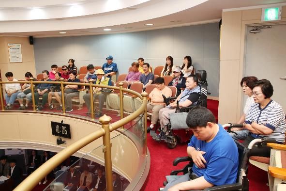 이날 밀양장애인평생학교 학생들은 제1차 본회의 방청을 마치고 허홍 의장, 박진수 부의장, 강창오 의원과 함께 기념촬영을 했다.