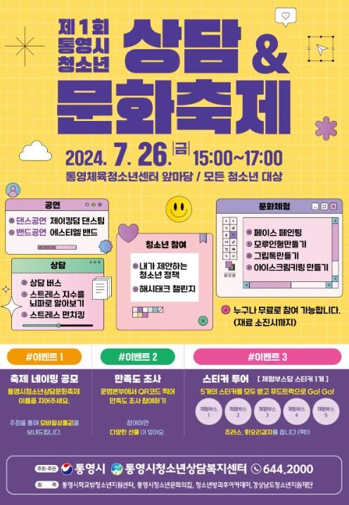 [경남도민뉴스] 통영시청소년상담복지센터는 오는 26일 15시부터 17시까지 통영체육청소년센터 앞마당에서 청소년 250여명을 대상으로 ‘제1회 통영시 청소년 상담·문화 축제’를 개최한다.