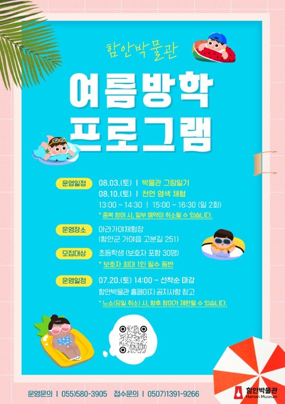 마지막 여름방학 프로그램은 매달 아라가야체험장에서 진행되고 있는 함안박물관 교육프로그램으로 이번 8월 3일(토)부터 3주 동안 ‘박물관 그림일기’, ‘천연 염색 체험’, ‘수박터지는 옛날 물총 싸움’을 진행한다.
