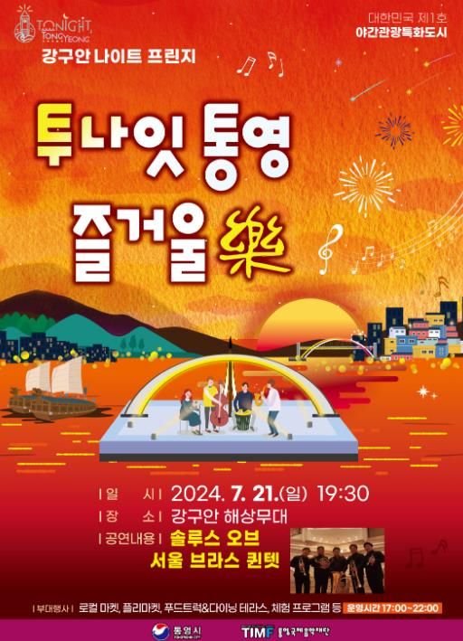 통영국제음악재단에서 주관하는 이번 공연은 지난 5월 25일을 시작으로 6월까지 총 3회에 걸쳐 진행된 야간관광 특화도시 통영의 상반기 야간관광 콘텐츠인 ‘투나잇 통영! 강구안 나이트 프린지’의 4번째 공연이다.