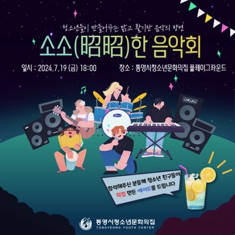 [경남도민뉴스] 통영시청소년문화의집은 오는 19일 오후 6시 통영시청소년문화의집 플레이그라운드에서 청소년 동아리 멤버들이 상반기 동안 갈고 닦은 솜씨를 발휘하는‘소소(昭昭)한 음악회'를 개최한다.