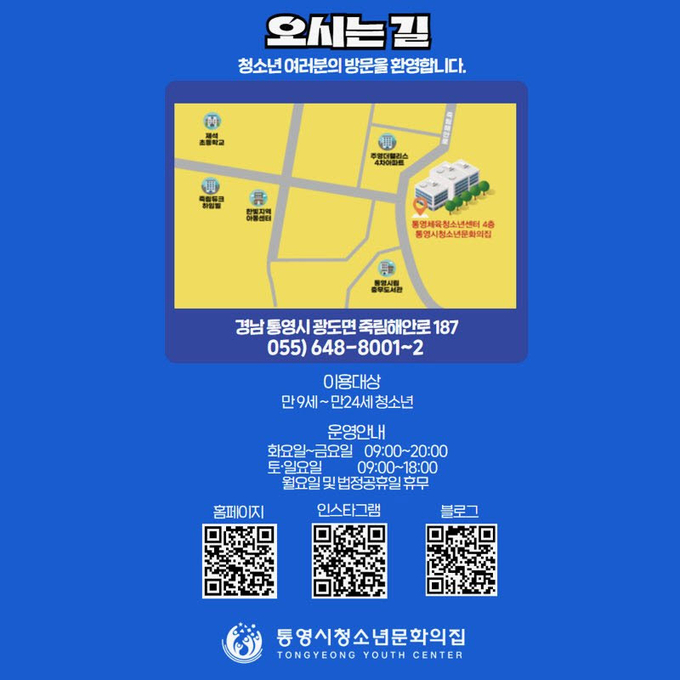 한편 통영시청소년문화의집은 광도면 소재 통영체육청소년센터 4층에 위치하고 있으며 운영 및 프로그램과 관련 문의는 통영시청소년문화의집 교육활동팀으로 하면 된다.