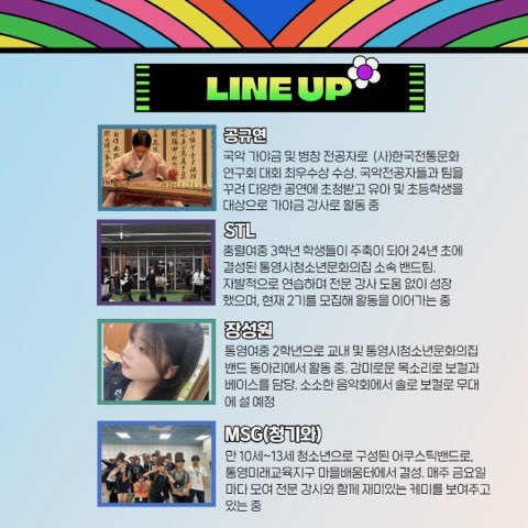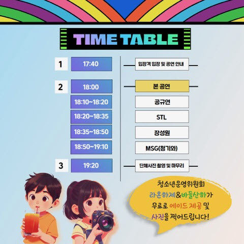 이날 공연팀 뿐만 아니라 통영시청소년문화의집 소속 ‘라온하제’청소년운영위원회는 참석한 관중들을 위해 음료(에이드)를 만들어 무료로 나눠 줄 예정이며, 통영시청소년수련원 소속 ‘바들산하’청소년운영위원회는 안전을 주제로 개인사진 무료 인화를 준비 중이다.