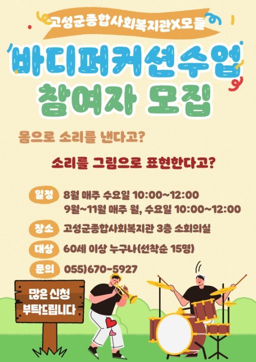 [경남도민뉴스] 고성군은 7월 16일부터 7월 30일까지 2024 찾아가는 문화로청춘 ‘둠!칫!팟! 바디퍼커션’ 참여자를 모집한다.