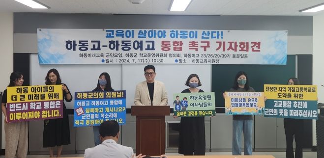 [경남도민뉴스] 하동군 학부모, 사회단체장, 일반 주민들로 구성된 ‘하동 미래교육 군민모임’과 학교운영위원장 협의회, 하동여고 기수별 동문들은 17일 하동교육지원청에서 하동의 교육위기 극복을 위해 하동고등학교와 하동여자고등학교 통합을 촉구하는 내용으로 기자회견을 개최했다.