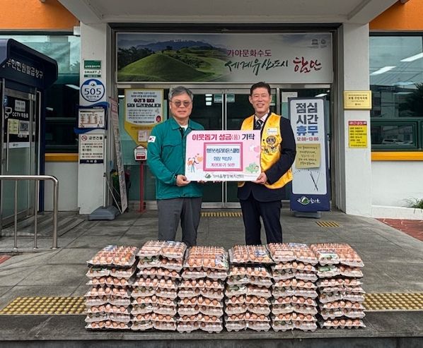 [경남도민뉴스] 함안산성라이온스클럽은 지난 17일 가야읍사무소를 방문해 계란 50판을 기탁했다.