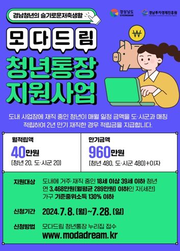 자세한 사항은 경상남도투자경제진흥원 사업1팀 모다드림 청년통장 지원사업 담당으로 문의하면 된다.