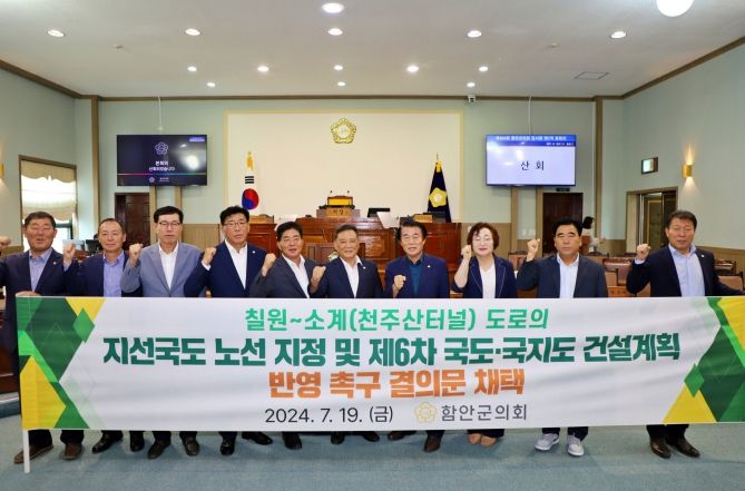 [경남도민뉴스] 함안군의회는 7월 19일 제304회 임시회 제1차 본회의에서 '칠원~소계(천주산터널) 도로의 지선국도 노선 지정 및 제6차 국도·국지도 건설계획 반영 촉구 결의안'(대표발의 황철용 의원)을 만장일치로 채택했다.