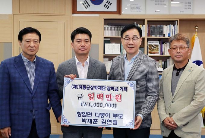 하동군장학재단은 지난 19일 청암면 시목마을 이장 박재훈 씨 부부가 일곱 번째 막내아들의 100일을 기념해 장학기금 100만 원을 기부했다고 밝혔다.