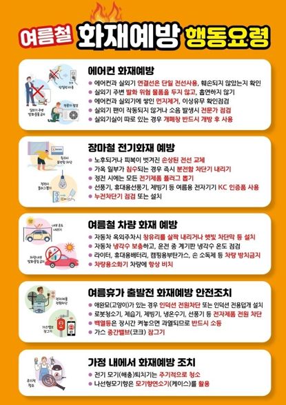 여름철 화재 예방 행동요령은 ▲에어컨 실외기 주변 발화 위험물질 비치 금지 ▲노후 전선 교체 ▲누전차단기 점검 ▲차량 내 차량용 소화기 비치 ▲여름휴가 출발 전 전자제품 전원 차단 등이다.
