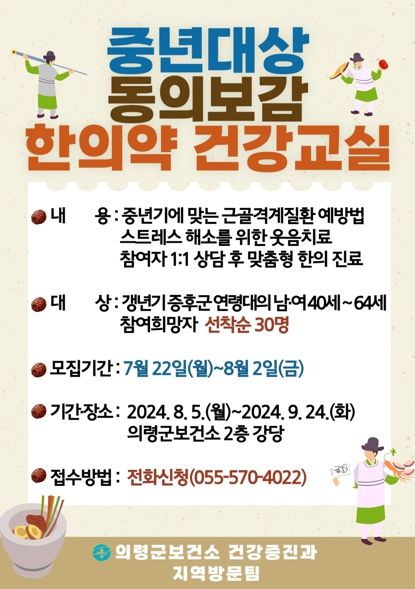 [경남도민뉴스] 의령군은 관내 40~64세 주민을 대상으로 중년대상 동의보감 한의약건강교실 참여자를 내달 2일까지 모집한다고 밝혔다.