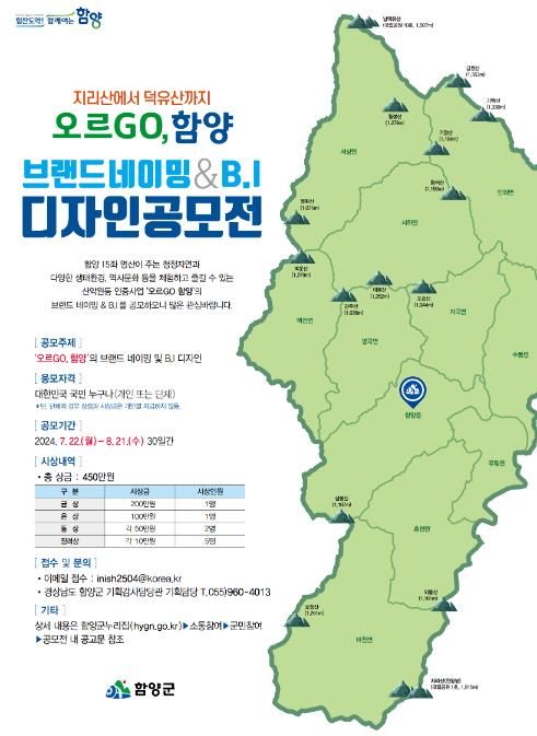 [경남도민뉴스] 함양군은 민선 8기 후반기 역점시책인 ‘오르고(GO), 함양’의 성공적인 브랜드화를 위해 다음 달 21일까지 전 국민을 대상으로 디자인 공모를 추진한다.
