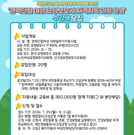 고성군에 주소를 둔 30대~60대 여성을 대상으로 모집하며 관내 요양보호사 교육원과 고성군간에 업무협약을 체결하여 운영할 예정이다.