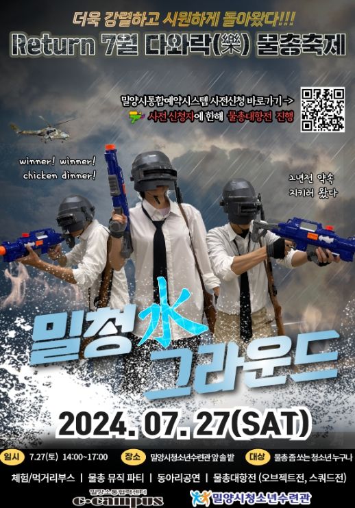 이날 행사는 △물총 대항전 물총 뮤직파티 △동아리 공연 △체험부스 등 청소년들이 뛰어놀며 즐길 수 있는 프로그램으로 구성되며, 동아리 공연과 체험부스는 밀양시 청소년수련관 축제기획단 ‘하랑’이 운영할 예정이다.