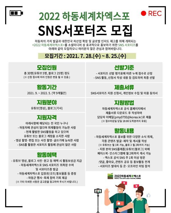 ‘하동세계차엑스포 sns서포터즈’는 하동 차에 관심이 많으며 취재활동이 가능한 자로, 현재 활발한 누리소통망서비스(sns) 활동을 하고 있으며 유튜브 또는 블로그 계정을 소지하고 영상 촬영·편집 또는 사진 촬영·글쓰기에 능숙한 사람이면 누구나 지원할 수 있다.