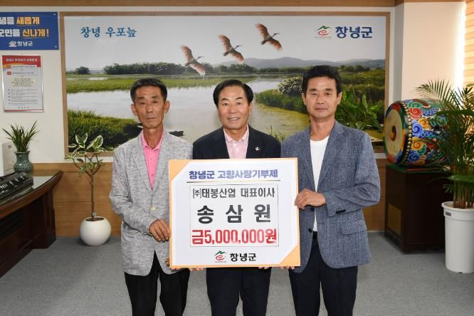 [경남도민뉴스] 창녕군은 지난 23일 ㈜태봉산업 송삼원 대표가 창녕군에 고향사랑기부금 연간 최대 기부 금액인 5백만 원을 기탁했다고 밝혔다.