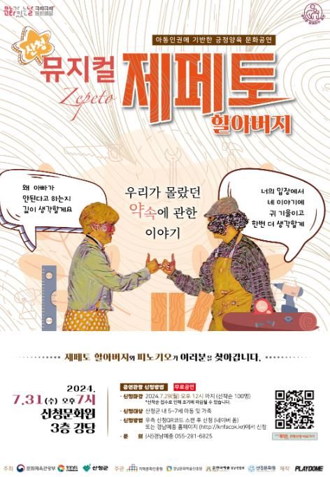 [경남도민뉴스] 산청문화원은 경남도 예술단체와 함께하는 광역교류 ‘뮤지컬-제페토 할아버지’ 공연을 오는 31일 문화원에서 연다고 26일 발혔다.