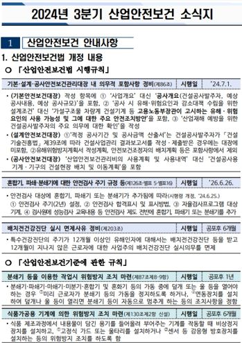 소식지의 주요 내용은 △산업안전보건 안내사항 △산업재해 발생현황 △우리군 우수사례 등으로 구성되어 있으며 산업안전보건법 개정내용, 계절별(온열질환예방, 장마철 안전수칙 등) 예방가이드, 산업안전보건위원회 심의·의결사항 등근로자들에게 꼭 필요한 내용이 함께 수록되어 있다.