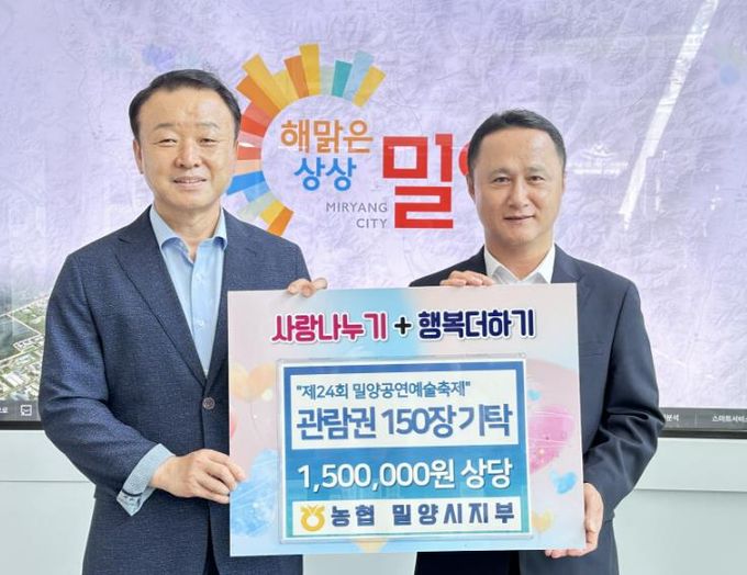 [경남도민뉴스] 밀양시는 26일 농협 밀양시지부가 문화 취약 계층에게 전달해 달라며‘제24회 밀양공연예술축제’관람권 150장(150만 원 상당)을 기탁했다고 밝혔다.