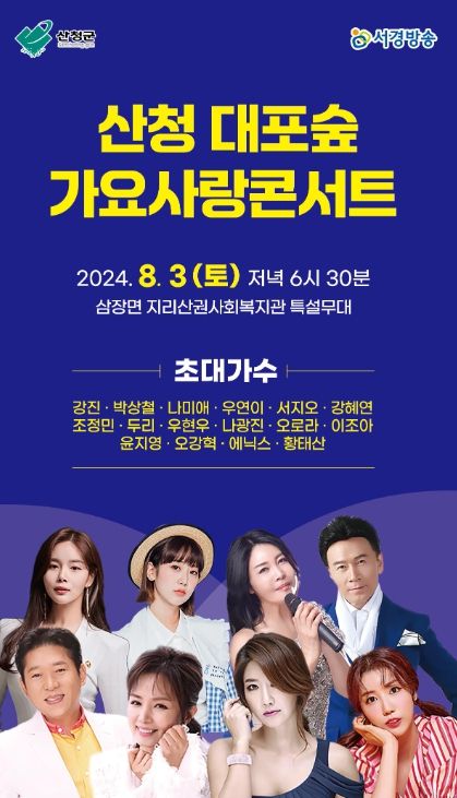 29일 산청군은 8월 3일 삼장면 지리산권 사회복지관 특설무대에서 ‘2024 산청 대포숲 가요사랑콘서트’를 개최한다고 밝혔다.