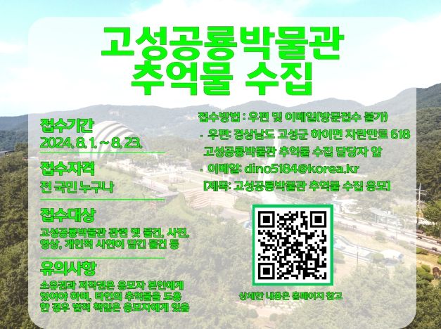 수집 대상은 문서류, 시청각류, 박물류로 사진, 영상, 포스터, 편지, 상장 등으로 고성공룡박물관 관련된 추억물을 소장한 사람이면 누구나 참여할 수 있다.