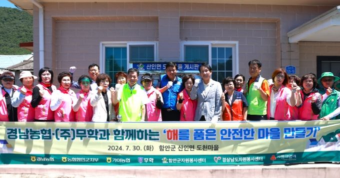 [경남도민뉴스] 함안군자원봉사센터는 지난 30일 산인면 도천마을에서 경남농협과 ㈜무학(회장 최재호), 경상남도자원봉사센터(센터장 정회숙), 경상남도사회복지공동모금회(회장 강기철)와 범농협 ESG활동의 일환으로 ‘해를 품은 안전한 마을 만들기’ 캠페인을 실시했다고 밝혔다.