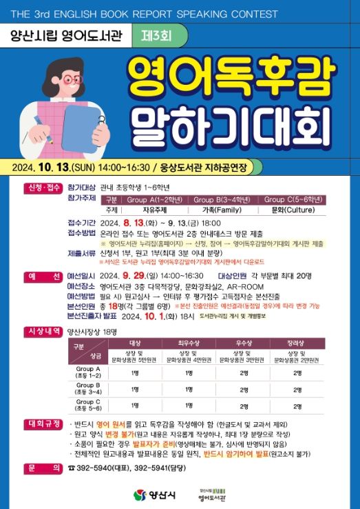 예선은 9월 29일 일요일 14시부터 영어도서관에서 실시하며, 각 부문별 본선 진출자 6명을 선정하여 10월 13일 14시부터 웅상도서관 지하공연장에서 본선 대회를 진행할 예정이다.