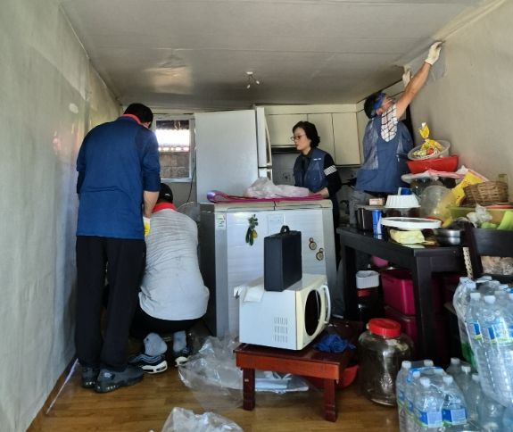 대상 가구는 도배, 장판, 전기설비, 대청소가 필요한 상황으로 삼랑진읍 지사협은 밀양 늘해랑 봉사단과 긴급 협력해 8월 무더위와 태풍이 오기 전 봉사활동을 신속히 진행했다.
