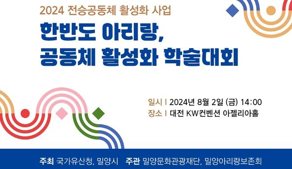 국가유산청의 2024 전승공동체 활성화 사업의 하나인 이번 학술대회는 1부‘유네스코 인류무형문화유산과 디아스포라’, 2부‘밀양아리랑 공동체 양상’이라는 주제로 학술연구의 장이 펼쳐질 예정이다.