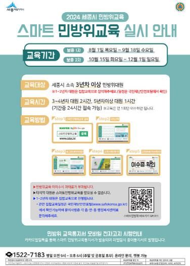 [경남도민뉴스] 세종특별자치시가 민방위 사태 발생 시 즉각 대처하는 능력을 키우기 위해 1일부터 내달 18일까지 2024년도 하반기 1차 민방위 사이버 및 집합교육을 실시한다.