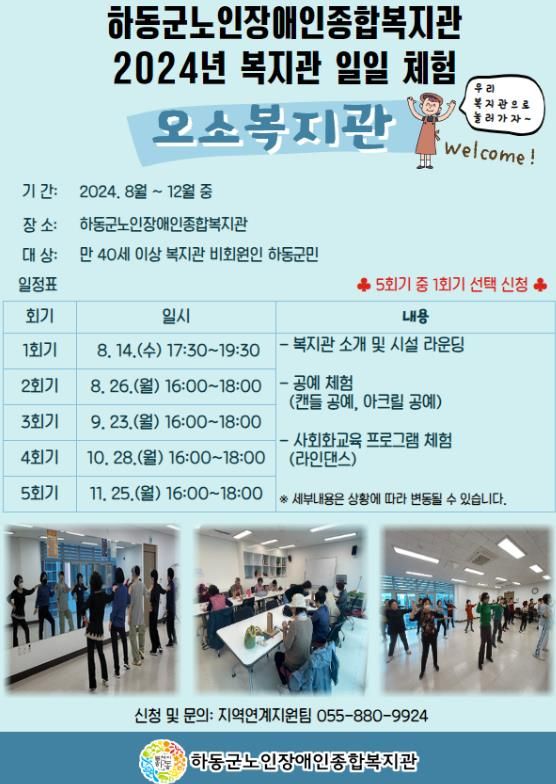 [경남도민뉴스] 하동군노인장애인종합복지관이 복지관 일일 체험 프로그램 ‘오소 복지관’ 참여자를 상시 모집한다.
