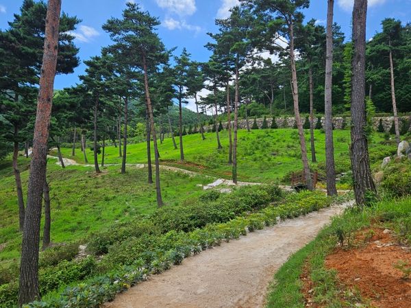 1일 산청군에 따르면 동의보감촌 내에 위치하고 있는 치유의 숲 건물 앞 녹지공간에 약 220m의 길이의 산책로가 조성됐다.