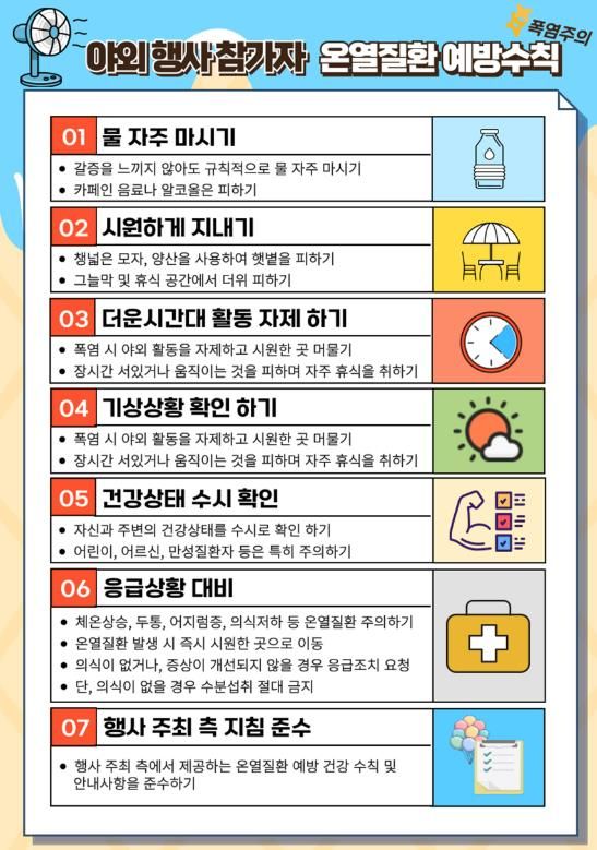 특히 8월 개최를 앞둔 야외 행사장에서도 온열질환 발생자 증가가 우려됨에 따라 시는 질병관리청의‘군중모임행사 온열질환 예방 가이드’를 주요 플랫폼과 게시판에 게재하여 시민들과 행사 관계자에게 홍보하고 나섰다.