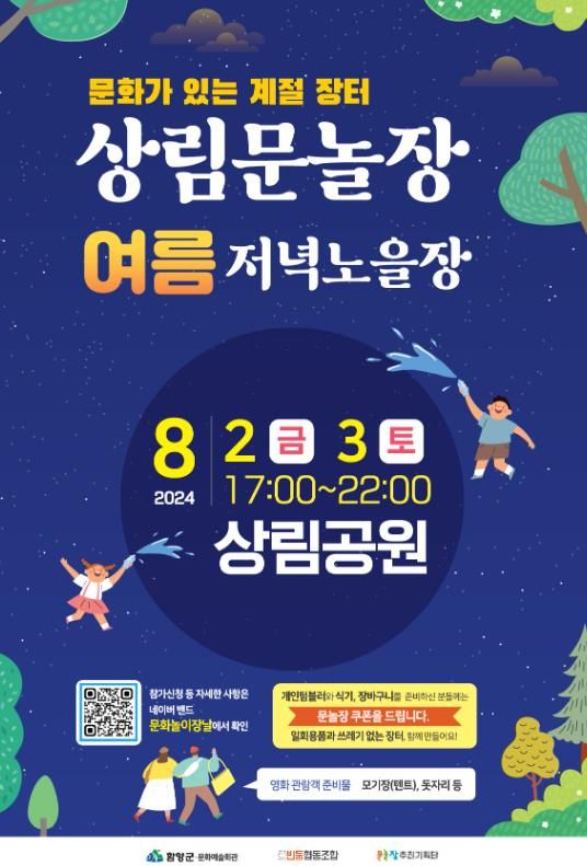 함양문화예술회관 관계자는 “풍성한 볼거리가 있는 함양 상림을 방문해서 영화도 보고, 문화놀이 체험 및 장터도 즐기고, 다양한 문화축제를 느껴보길 바란다.”라고 전했다.