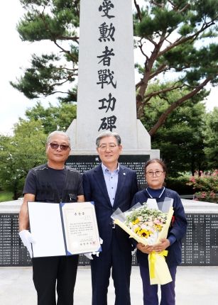 [경남도민뉴스] 의령군은 지난 2일 호국 무공수훈자 전공비 앞에서 6·25전쟁 참전용사인 故홍성택 상병의 유가족(자녀 홍원기)에게 화랑무공훈장을 전수했다.
