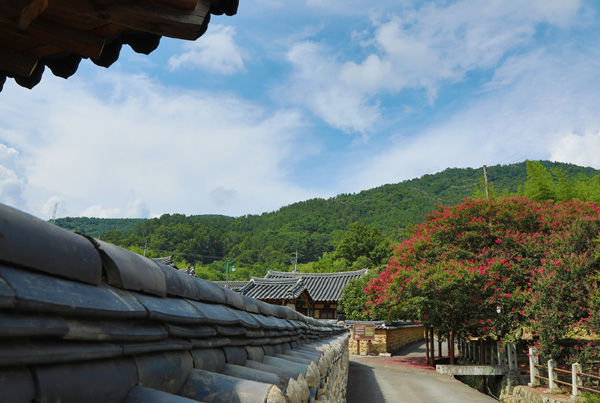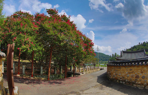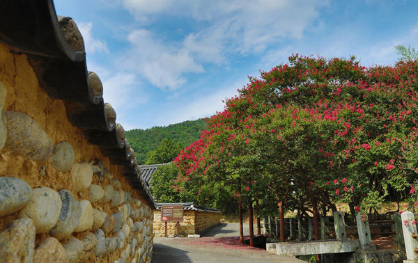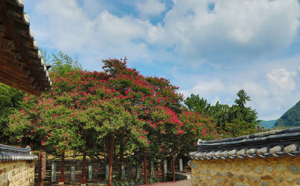 [경남도민뉴스] 함안군 산인면 모곡리 고려동유적지(기념물 제56호) 입구의 배롱나무. 7월부터 피기 시작한 배롱나무 붉은 꽃이 고려종택의 기와지붕, 황토담장과 어우러져 화려한 자태를 뽐내고 있다. 높이 8m, 둘레 1.3m의 보호수다. 꽃은 9월까지 볼 수 있다. 100일 동안 피고 지고를 반복해 백일홍으로 불리기도 한다.