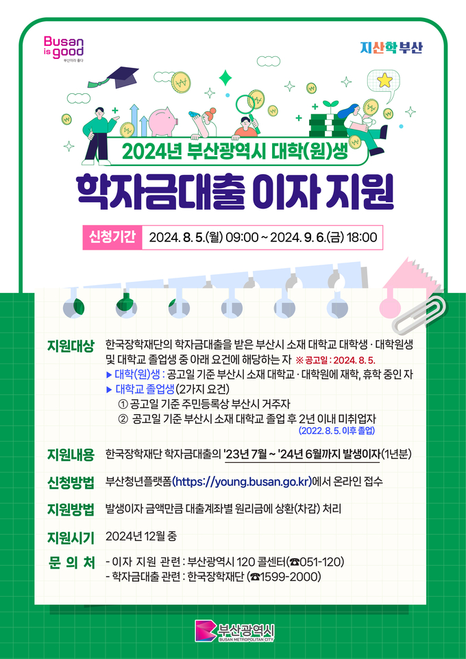 [경남도민뉴스] 부산시(시장 박형준)는 오늘(5일)부터 「2024년 부산광역시 대학(원)생 학자금대출 이자지원 사업」 신청자를 모집한다고 밝혔다.