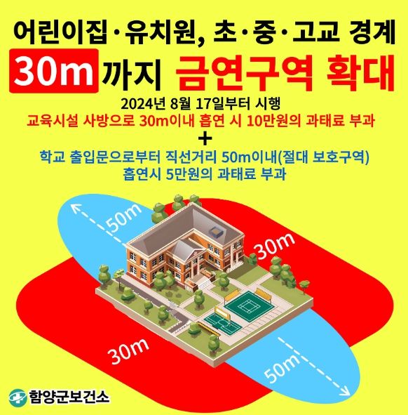 [경남도민뉴스] 함양군은 국민건강증진법 개정에 따라 오는 17일부터 관내 어린이집과 유치원, 초·중·고등학교 총 45개소의 금연구역을 확대·신설 지정한다고 5일 밝혔다.