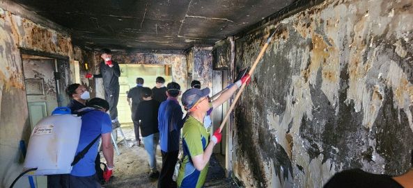 봉사활동을 실시한 세대는 가스 폭발 사고 가구의 바로 옆집으로 화재로 집이 반소돼 그을음이 심각한 상태였다.