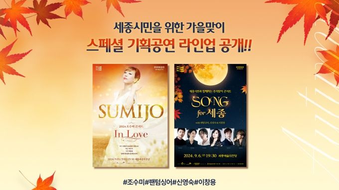 [경남도민뉴스] 세종시문화관광재단은 세종시민을 위한 가을맞이 스페셜 기획 공연으로 ‘2024 조수미콘서트-In Love’와 ‘SONG for 세종 with 팬텀싱어, 신영숙·이창용’을 9월 5일과 6일 양일간 세종예술의전당에서 개최한다고 밝혔다.