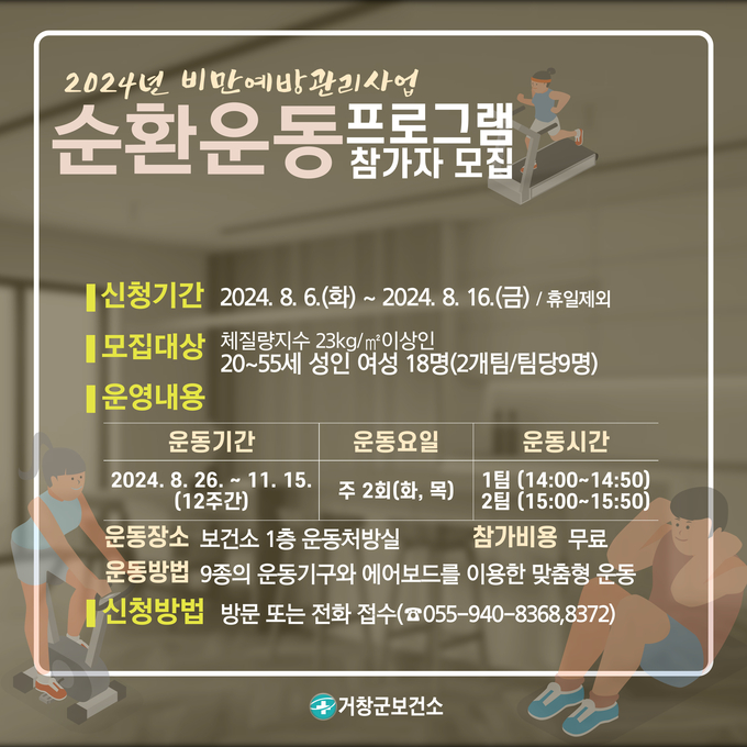 [경남도민뉴스] 거창군은 8월 6일부터 16일까지 2주간 비만예방관리사업 ‘순환운동 프로그램’ 참여자 18명을 선착순 모집한다고 밝혔다.