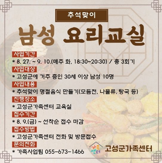 [경남도민뉴스] 고성군가족센터는 오는 8월 9일부터 ‘추석맞이 남성 요리교실’ 참여자를 선착순으로 모집한다고 밝혔다.