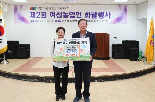 이날 기탁식은 산인면 드윌연수연에서 개최된 제2회 여성농업인 화합행사에서 진행됐으며, 조근제 함안군수와 (사)한국여성농업인 함안군연합회 회원 80명 및 행사관계자가 참석했다.