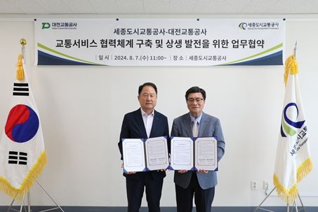 [경남도민뉴스] 세종도시교통공사와 대전교통공사가 7일 오전 첨단BRT차고지에서 교통서비스 협력체계 구축 및 지역사회 상생발전을 위한 업무협약을 체결했다.